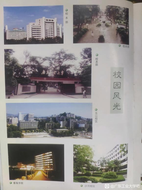 图〡广东工业大学曾经出版过介绍册 其中的“校园风光”有五山校区(原广东机械学院)全景照,对比本部和其它校区显得气势恢宏。 1995年6月,广东机械学院与广东工学院、华南建设学院(东院)三校合并,成立广东工业大学,标志着广东工业大学实现了第一次历史性跨越,学校发展揭开新的篇章。广东机械学院原址成为广东工业大学五山校区。 图〡1995年,广东工业大学五山校区揭幕仪式 广东工业大学五山校区,位于广州市天河区广园东路,占地面积203亩,建设学院、材料能源学院和信息工程学院设于这里。五山校区,最显著的标志就是矗立在校园正中央…